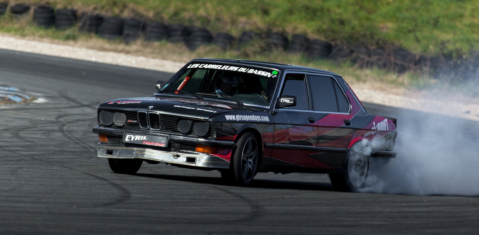 Une puissante berline en dérapage contrôlé, sur le circuit de Bordeaux Mérignac (2014, © GTRS Open Days)
